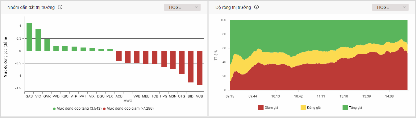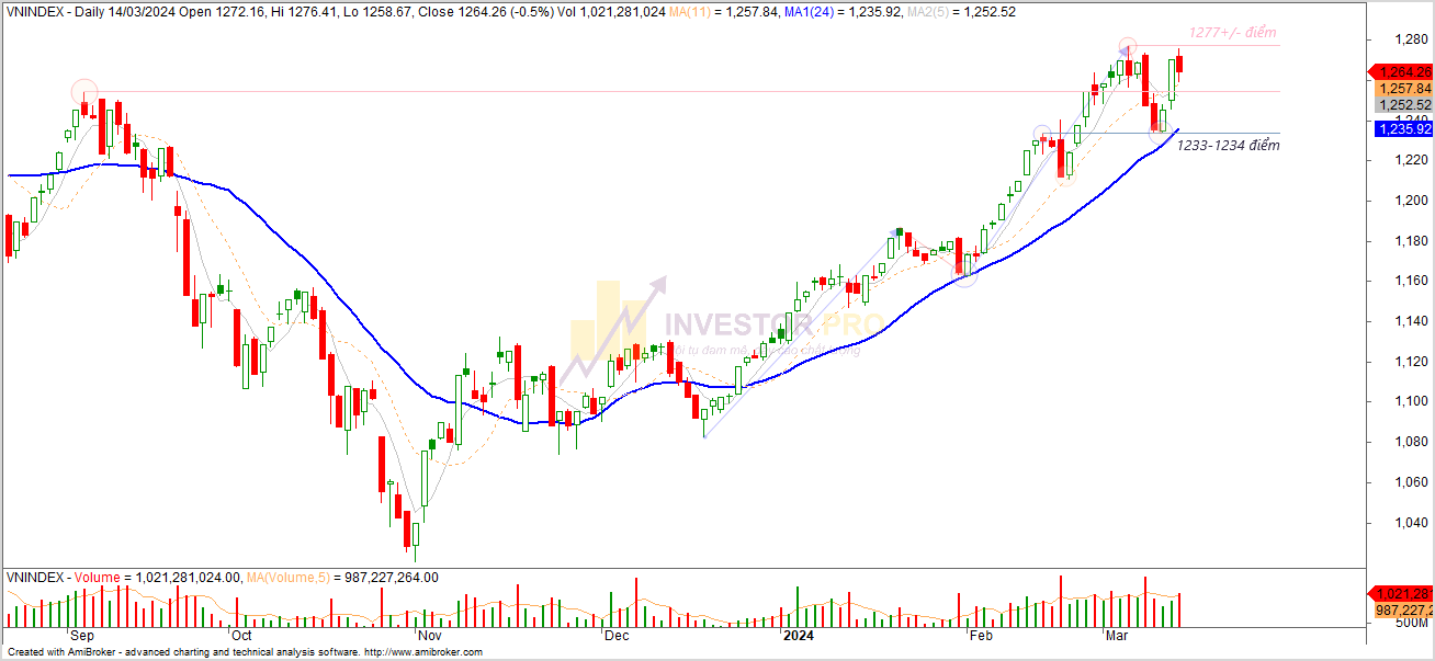 Kết thúc phiên giao dịch ngày 14/03/2024 chỉ số Vn-Index đóng cửa tại 1264.26 điểm (giảm nhẹ -6.25 điểm, tương đương -0.49%), độ rộng giảm giá đạt 52.71% số cổ phiếu giảm giá và 34.84% số cổ phiếu tăng giá, tổng giá trị giao dịch đạt 27,961 tỷ đồng (tăng nhẹ hơn so với phiên hôm qua).