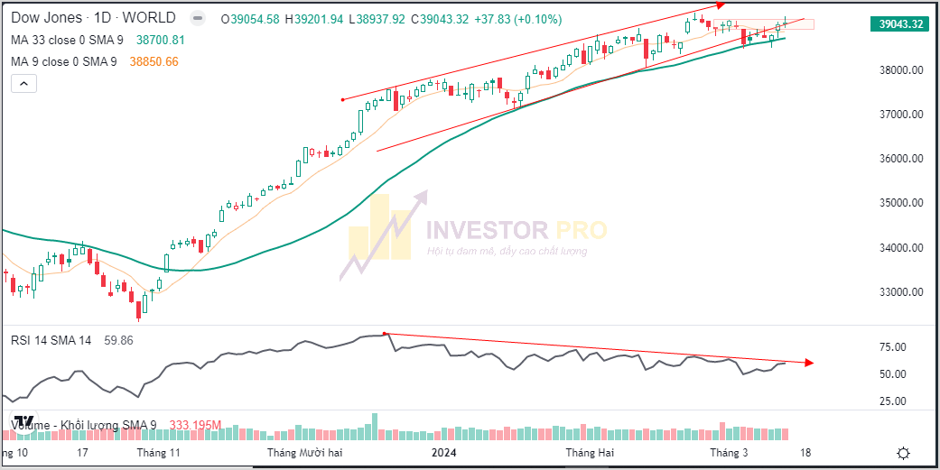 iPro cũng nhận thấy thị trường Việt Nam đang bị tác động và có sự tương đồng về sự biến động với chỉ số Dow Jones (DJ), nên chúng ta cũng cần quan sát thêm chỉ số DJ vào các phiên tới. Hiện tại, chỉ số DJ sau khi xuất hiện phiên bán mạnh gãy cạnh dưới và xác nhận mẫu hình giảm giá Rising Wedge (Cây nêm hướng lên) thì nay đã giằng co 6 phiên liên tiếp.
