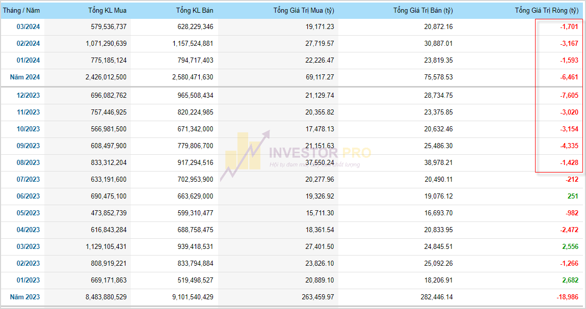 Điểm qua một chút giao dịch của khối ngoại trên sàn Hose từ đầu năm tới nay có thể thấy tháng nào cũng có kết quả bán ròng, lũy kế từ đầu năm tới hiện tại khối ngoại đã bán hơn 6,461 tỷ đồng, thực tế áp lực rút ròng của khối ngoại bắt đầu xuất hiện từ tháng 08/2023 và cho tới nay vẫn chưa thấy dừng lại - bạn có thể xem thống kê bảng dưới đây.
