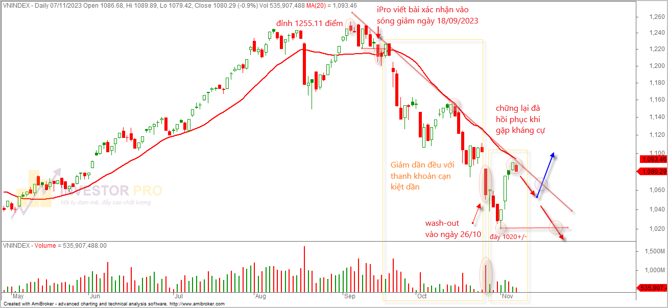 Thị trường thời gian qua, nếu bạn còn nhớ thì chúng ta đã trải qua giai đoạn điều chỉnh từ điểm cao nhất là 1,255.11 điểm vào ngày 07/09/2023 và xác nhận bước vào xu hướng sóng giảm vào ngày 18/09/2023 (iPro đã dự báo chính xác điểm bước vào sóng giảm của thị trường thời điểm này, Mời bạn đọc bài viết Tại đây). Sau đó là những chuỗi ngày tăng/giảm đan xen với phần lớn tâm lý nhà đầu tư ban đầu đều cho rằng thị trường chỉ điều chỉnh nhẹ rồi tăng trở lại, hàng loạt bài viết dự báo vùng tạo đáy nhưng sau đó đều bị xuyên thủng hoàn toàn, rất nhiều phiên giao dịch bất thường với lệnh bán ATC dồn dập, thanh khoản cạn kiệt dần.