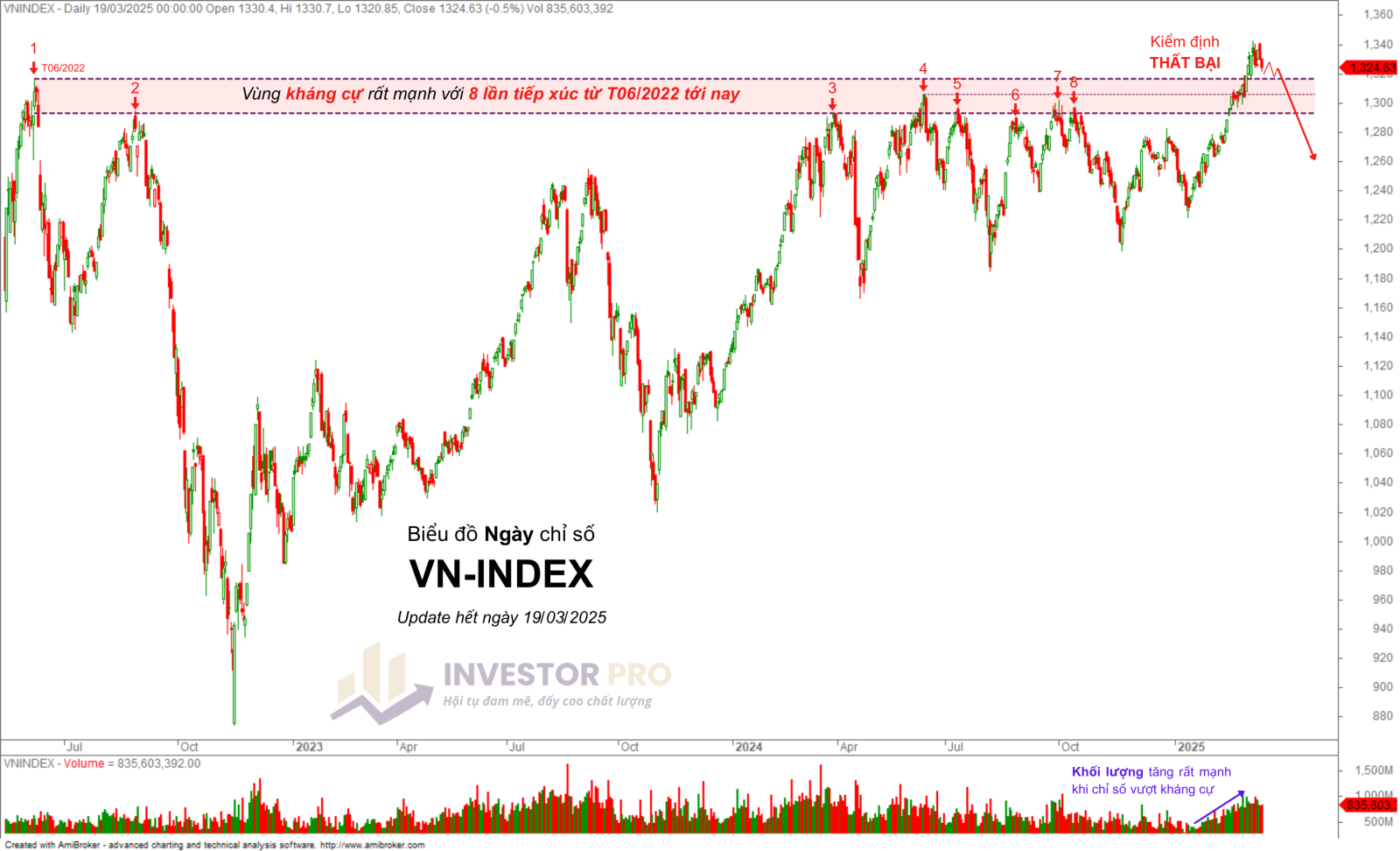 Kháng cự và hỗ trợ là công cụ đơn giản và hiệu quả nhất để phân tích xu hướng và nhận diện các mốc giá (price) quan trọng của thị trường. Quan sát biểu đồ ngày của VN-Index cập nhật đến hết phiên giao dịch 19/03/2025, dễ dàng nhận thấy từ tháng 06/2022, chỉ số này đã 8 lần tiếp cận vùng kháng cự lịch sử quanh 1.300 điểm nhưng đều thất bại vào các thời điểm: Tháng 06/2022, 08/2022, 03/2023, 06/2024, 07/2024, 08/2024 và 2 lần trong tháng 10/2024. Điều này chứng tỏ đây là một vùng kháng cự rất mạnh, được củng cố qua thời gian hơn 2 năm.