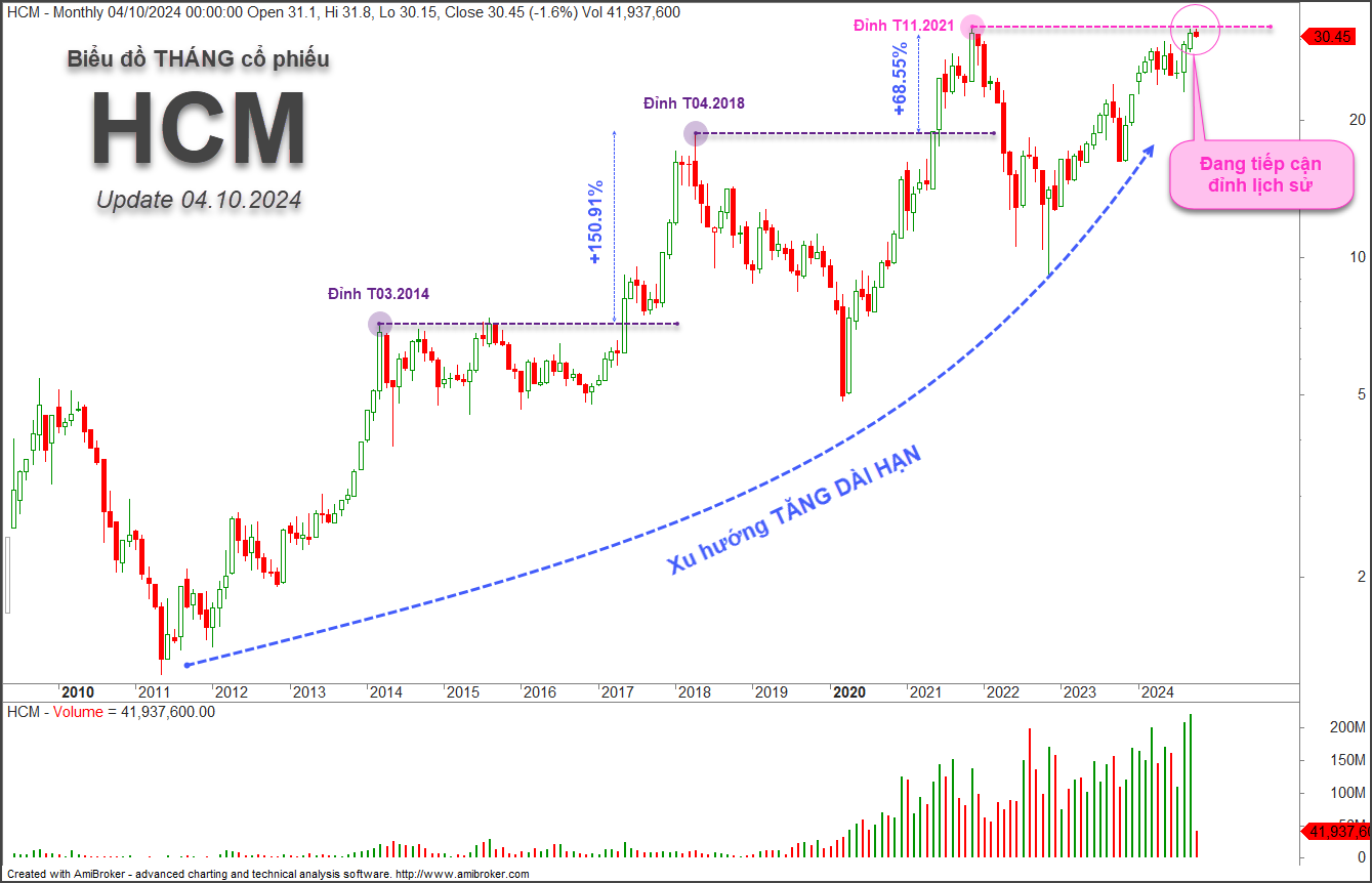 Biểu đồ tháng cổ phiếu HCM từ lúc niêm yết lên sàn tới hiện tại (04.10.2024)