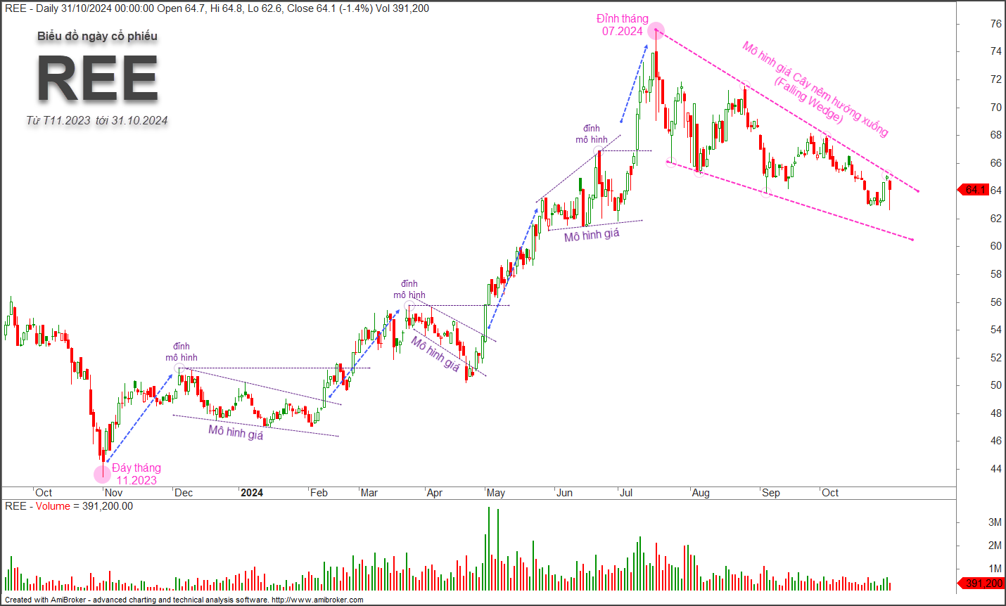 Bây giờ chúng ta nhìn sát hơn chút nữa về biểu đồ giá của REE từ tháng 11.2023 tới hiện tại (31.10.2024). Bạn đọc có thể thấy sau khi cổ phiếu tạo đáy vào tháng 11.2023 (đây cũng chính là thời điểm tạo đáy của thị trường chung) thì sau đó cổ phiếu tăng mạnh lên tới khi tạo đỉnh vào tháng 07.2024 và quá trình vận hành con sóng tăng này diễn ra khá nhẹ nhàng, với những sóng thứ cấp giảm đều được hình thành dưới dạng mô hình giá, mức giảm của mô hình rất nhẹ, trong khi sóng thứ cấp tăng lại là những con sóng tăng mạnh - hay nói cách khác là cổ phiếu cứ tăng mạnh lên rồi tích lũy nhẹ nhàng bằng mô hình giá, rồi sau đó tiếp tục tăng mạnh.