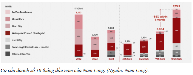 Số liệu cập nhật đến hết tháng 10/2025 cho thấy doanh số bán hàng (pre-sales) của Nam Long đạt xấp xỉ 9.300 tỷ đồng. Kết quả này đánh dấu mốc kỷ lục mới của doanh nghiệp, vượt qua con số cao nhất từng ghi nhận là 8.200 tỷ đồng của cả năm 2022.