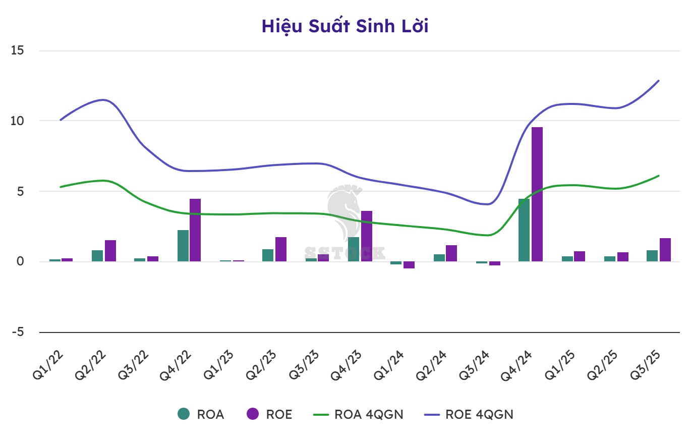Biểu đồ cho thấy bức tranh sinh lời phụ thuộc hoàn toàn vào "cú hích" lợi nhuận đột biến vào Q4/2024 (khả năng do bàn giao dự án hoặc thoái vốn). Từ cuối năm 2024, ROE có xu hướng cải thiện.