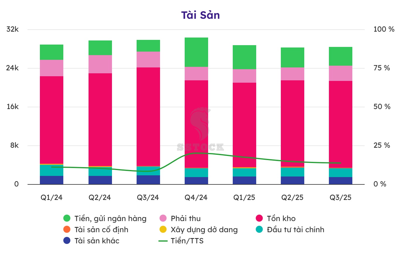 Quy mô tài sản lớn quanh 28.000 tỷ đồng. Hàng tồn kho chiếm tỷ trọng cao (trên 60% tổng tài sản), cho thấy vốn đang bị "chôn" tại các dự án dở dang.